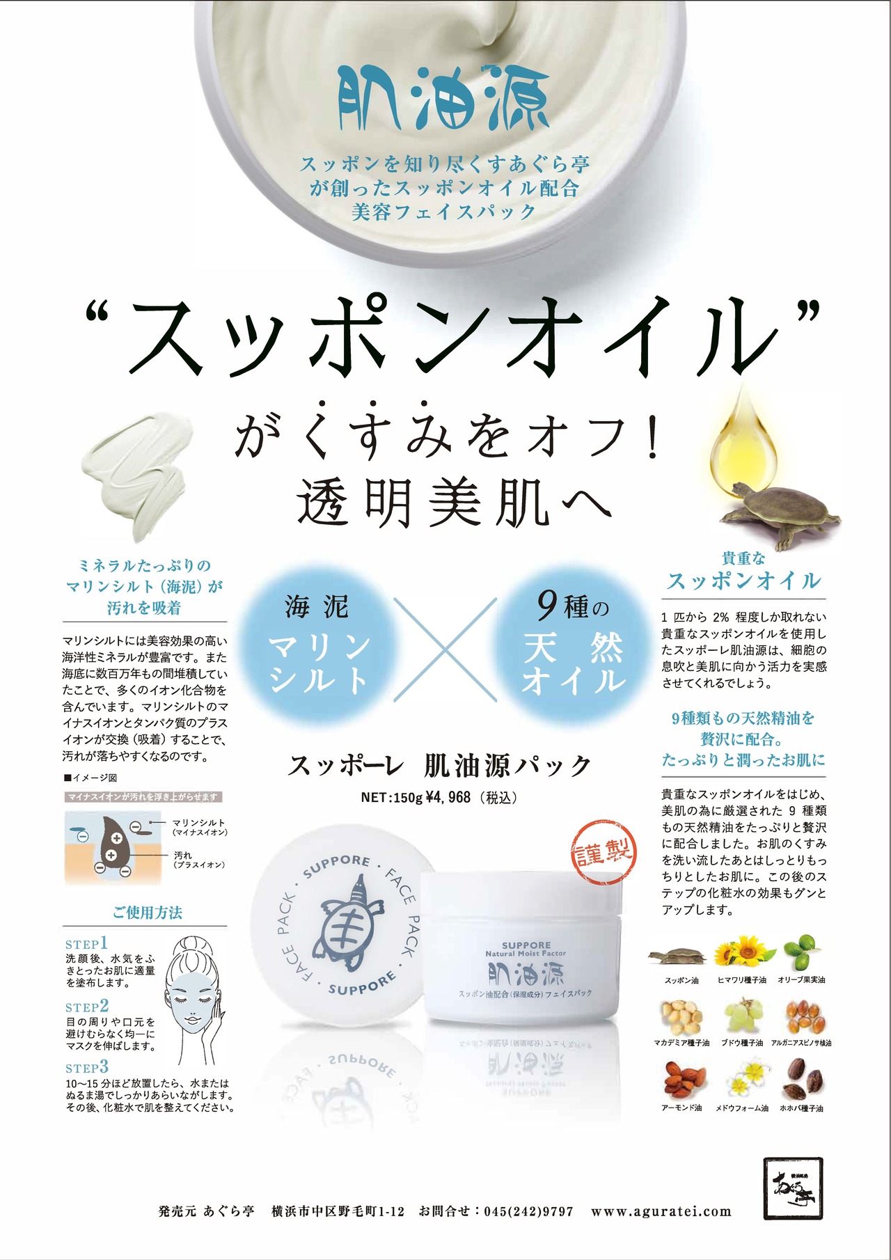 スッポーレ 肌油源パックは、厳選された成分と現代のスキンケアテクノロジーを融合させた特別なパックです。沖縄の海泥「マリンシルト」と希少なスッポンオイルをはじめ、9種類の天然由来オイルが肌をやさしく整え、健やかで清らかな印象の肌へ導きます。